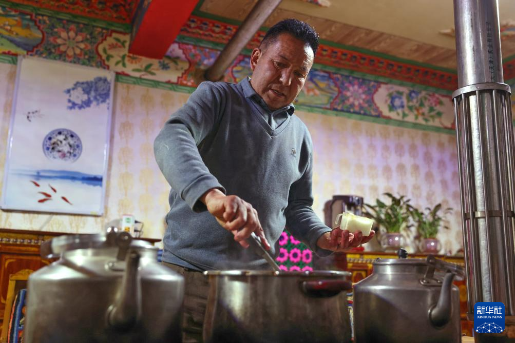 2月16日,在拉薩堆龍德慶區(qū)東嘎街道桑木社區(qū),群群在攪拌“古突”。新華社記者 丁增尼達 攝
