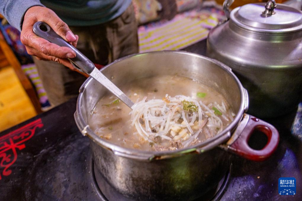 2月16日,在拉薩堆龍德慶區(qū)東嘎街道桑木社區(qū),群群的妻子扎桑(左)在為家人盛“古突”。新華社記者 丁增尼達 攝