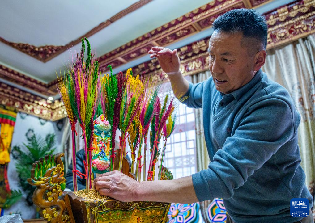 2月16日,在拉薩堆龍德慶區(qū)東嘎街道桑木社區(qū),群群在裝扮切瑪盒(五谷豐登斗)。新華社記者 丁增尼達 攝