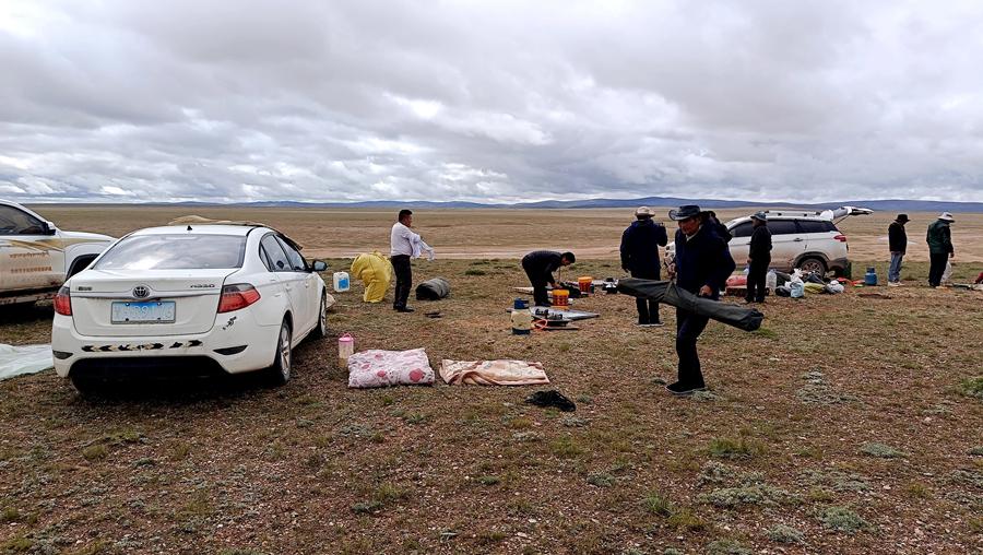 2025年8月,曲麻萊縣勒池村藏羚羊遷徙護(hù)航隊(duì)在護(hù)航途中搭帳篷。新華社發(fā)