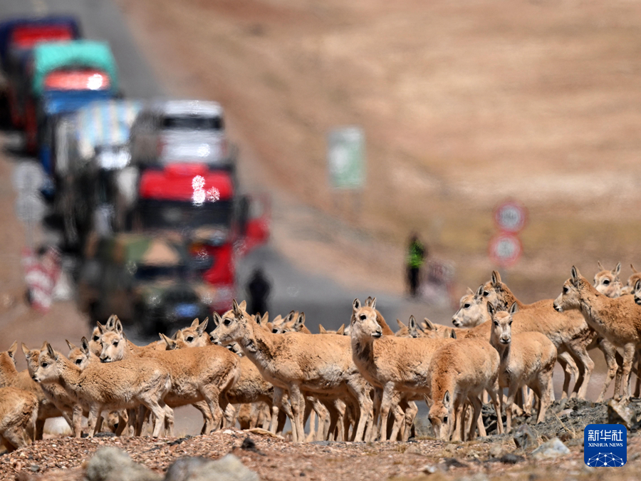 一群待產(chǎn)雌性藏羚羊通過青藏公路前往可可西里卓乃湖產(chǎn)仔(2023年5月29日攝)。新華社記者 張宏祥 攝