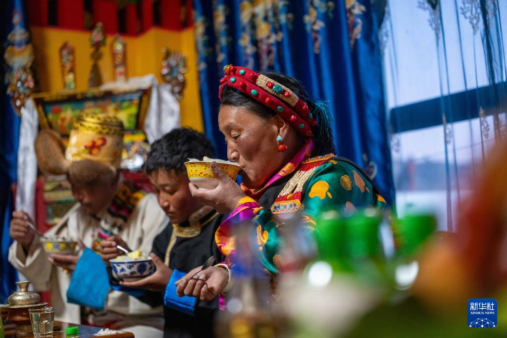 2月16日,長所鄉(xiāng)古榮村村民卓瑪次仁(右)與家人一起吃年節(jié)食品“古突”。在藏語中,“古”意為“九”,“突”意為“面”,“古突”是一種用牦牛肉湯加入牛肉、蘿卜、奶渣等食材熬煮的面食。按西藏傳統(tǒng)習俗,“古突”夜,家家戶戶迎來團聚,一起享用“古突”。新華社記者 旦增尼瑪曲珠 攝