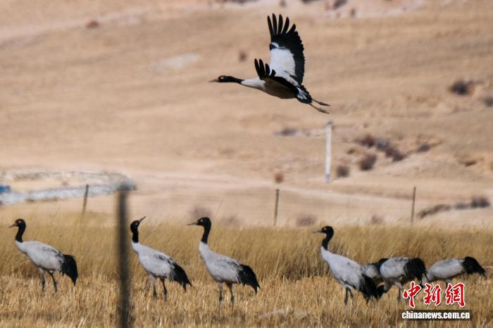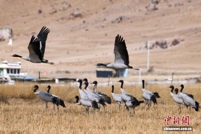 黑頸鶴是中國國家一級保護動物,是唯一生活、繁殖在高原的鶴類,被藏族民眾譽為“吉祥鳥”。近日,西藏自治區(qū)拉薩市林周縣林業(yè)和草原局介紹,作為黑頸鶴重要的越冬棲息地,今年該縣境內黑頸鶴數(shù)量在1800只至2300只之間,其中虎頭山水庫卡東村一帶占比約一半。中新網(wǎng)記者在周邊看到,不少黑頸鶴在田間覓食,不時飛翔于高原農(nóng)田、村落上空,舞動的鶴影和聲聲鶴鳴為冬春時節(jié)的高原增添了幾分靈動。