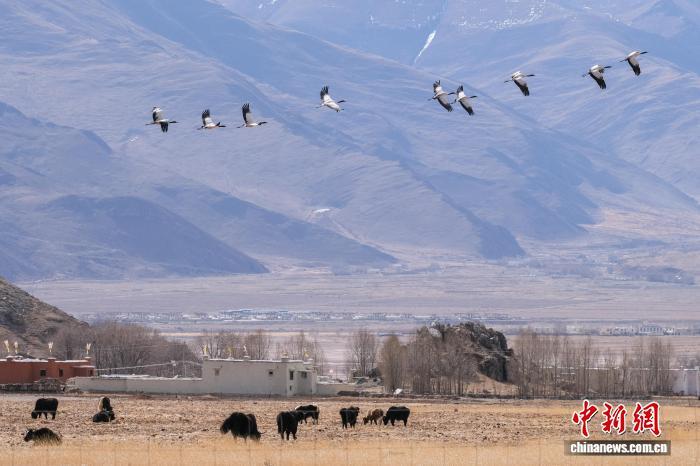 圖為2月8日,翱翔的黑頸鶴群與高原牦牛以及村落組成一幅優(yōu)美的畫面。江飛波 攝