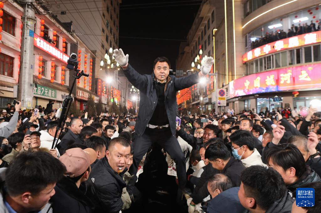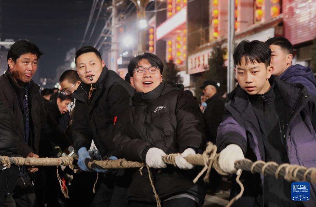 3月3日,在臨潭縣城關(guān)鎮(zhèn)西大街,當(dāng)?shù)厝罕妳⒓印叭f人扯繩”民俗活動(dòng)。新華社記者 張?!z