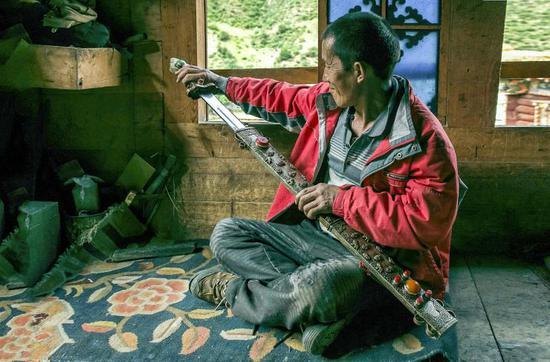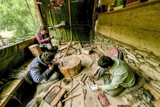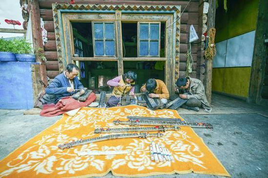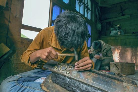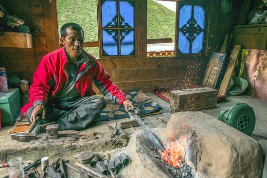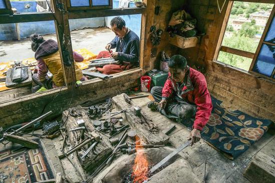 家族式的藏刀制作作坊,由上了年紀(jì)的老人帶領(lǐng)并傳授技藝。