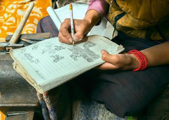 藏刀刀鞘上的圖案,都是用鉛筆在紙本上勾畫出原型,再進(jìn)一步雕刻到刀鞘上。