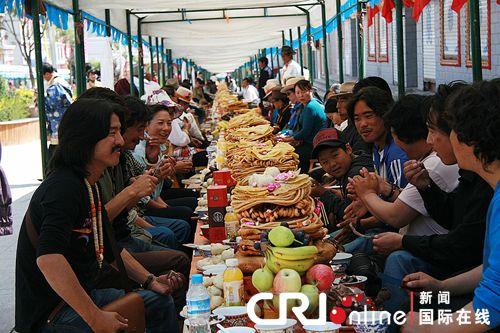 ????藏語“達頓”中“達”是“箭”,“頓”是“宴”的意思。“達頓”意為“神劍之宴”?!斑_頓節(jié)”以民間射箭和情歌對唱為主題,將箭技切磋、民間歌舞、說唱藝術和美酒佳肴融為一體,展示著藏族人民豐富多彩的民族文化。2012年9月,尖扎縣舉辦的“達頓文化節(jié)”上,千人的“達頓宴”頗為壯觀。在縣中心的馬克唐鎮(zhèn)500米步行街兩側擺放著560多張餐桌,桌上擺滿手抓羊肉、酥油糌粑、蕨麻米飯、藏式酸奶、藏式甜點等各類美食,2000多名中外賓客齊聚一堂,共享美食。來自美國的弓箭射手埃里克·斯坦博林第一次享受如此盛大的“達頓宴”,對于美味的藏餐贊不絕口。