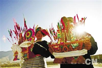 秋收時(shí)節(jié)的農(nóng)事活動(dòng)十分豐富,也是農(nóng)耕民俗產(chǎn)生最為頻繁的季節(jié),他們常常以集體的方式舉行活動(dòng),在這種場合,農(nóng)民除了表達(dá)豐收的喜悅以外,更多的是將農(nóng)作物產(chǎn)品奉獻(xiàn)給神靈。一則是對(duì)神靈保佑農(nóng)業(yè)豐收的酬謝,另一方面就是期望神靈繼續(xù)對(duì)農(nóng)業(yè)生產(chǎn)和農(nóng)作物的生長進(jìn)行保護(hù)。這種信仰心態(tài)在西藏農(nóng)區(qū)的一些秋收習(xí)俗中表現(xiàn)得淋漓盡致。