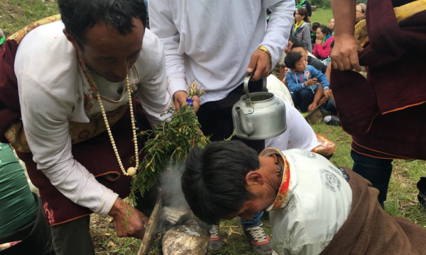 煨桑,是拉卜楞地區(qū)僧俗中最普遍的一種祈愿儀禮,最佳時間是早晨。每逢初一、初三、初八、十五、三十或宗教紀(jì)念日,一大清早起床后,首先在自家院或房頂煨桑,然后帶上柏樹枝、桑仔、