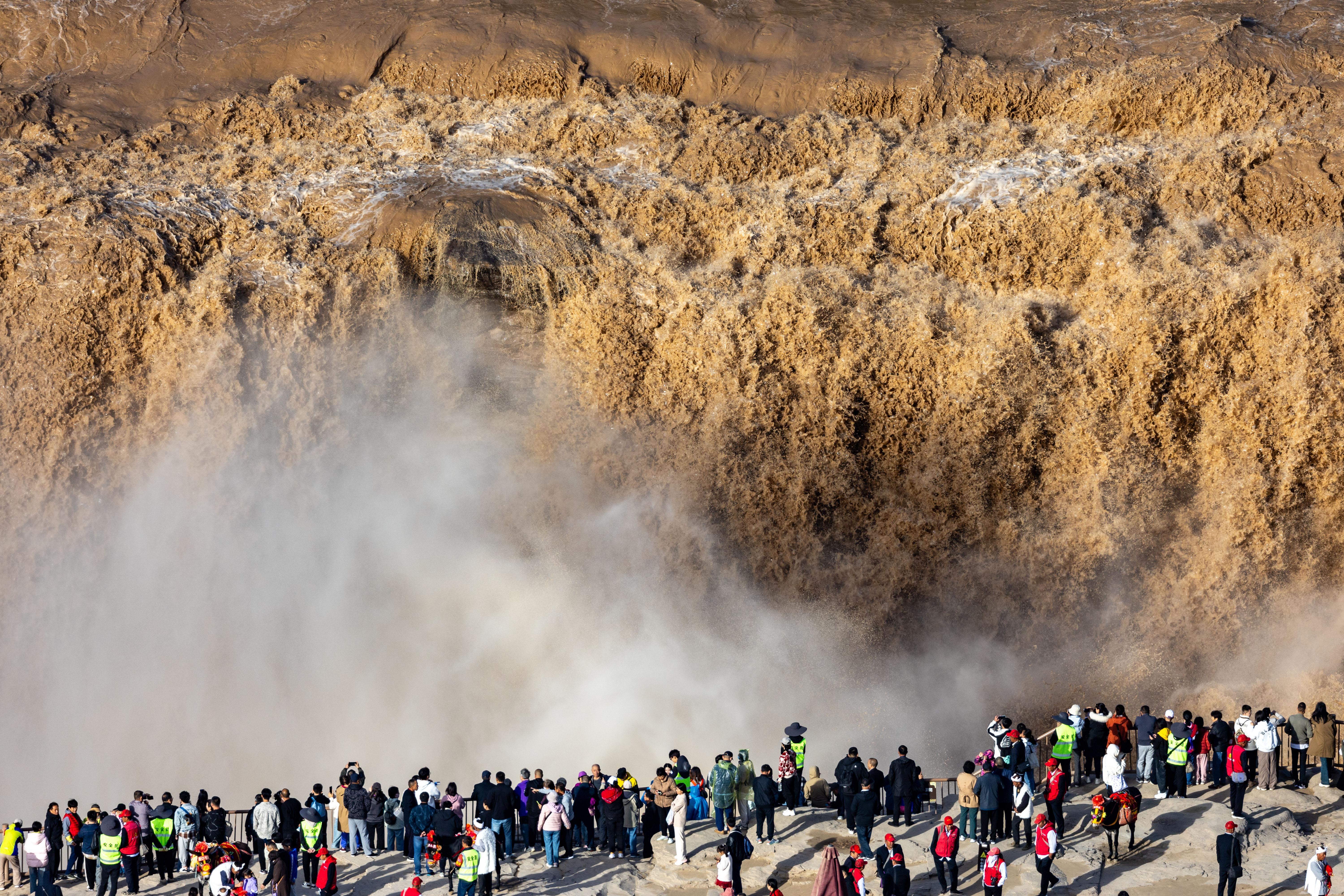 游客在山西省臨汾市吉縣黃河壺口瀑布景區(qū)游覽觀瀑(10月1日攝)。新華社發(fā)(劉宏達(dá)攝)