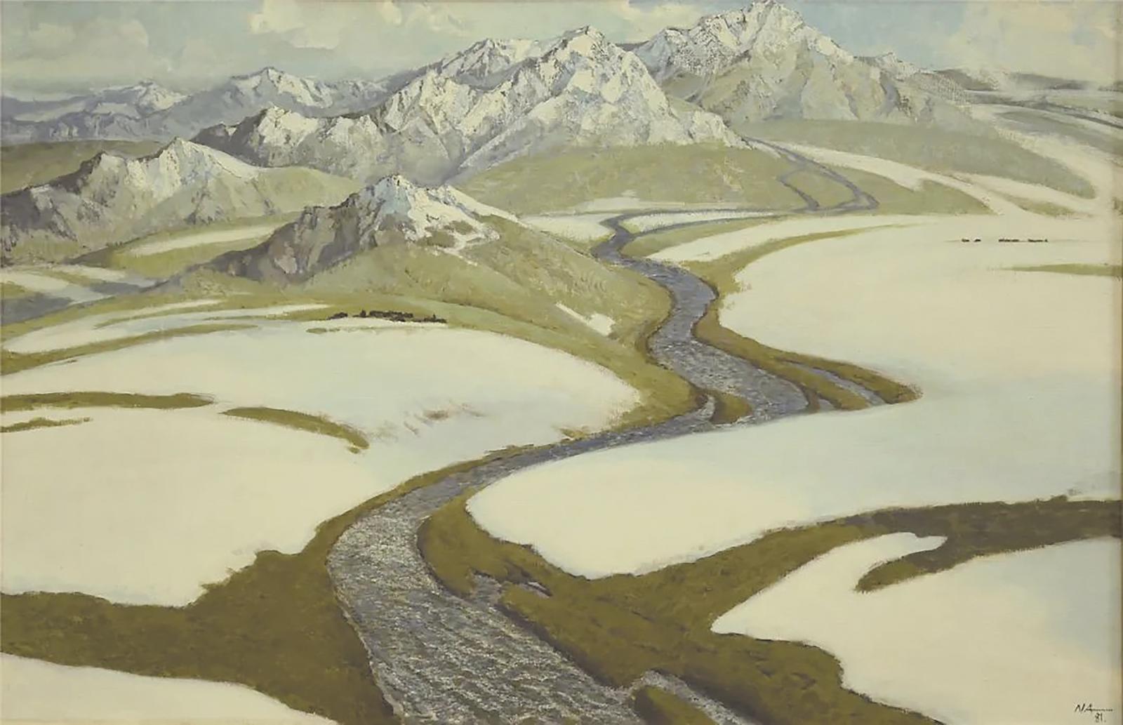 黃河從巴顏喀拉雪山發(fā)源,流經(jīng)青海,塑造了青海境內(nèi)神奇瑰麗的自然地貌和生態(tài)景觀,也孕育了多彩的高原文化與河湟文明。一直以來,圍繞黃河文化與生態(tài)文明進行的藝術(shù)創(chuàng)作從未停止。1980年,在青海文聯(lián)工作、生活了21年之久的畫家朱乃正先生,在即將離開青海之際,登上黃河上游的松巴峽,驚望白云沖天之境,心潮澎湃,創(chuàng)作完成了油畫作品《青海長云》,畫面中縱貫天地的長云之勢如黃河奔騰、博大壯麗;次年,他又創(chuàng)作完成了另外一幅油畫作品《黃河源》,其構(gòu)圖形式中則充滿著寧靜的理性之美。這兩幅繪畫作品都體現(xiàn)出畫家對黃河文明的贊嘆以及對黃河之源——青海自然生態(tài)景象的真情藝術(shù)呈現(xiàn),作品飽含著畫家對青海的深情眷戀。