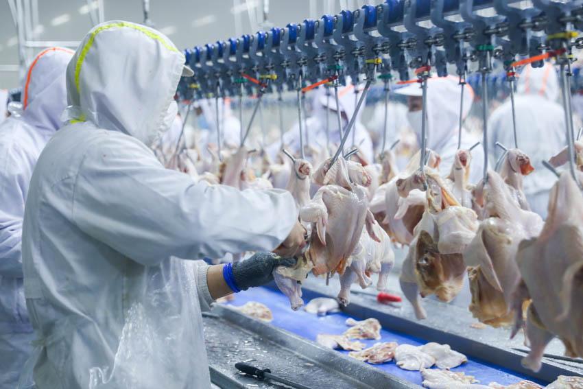 走進(jìn)禾豐食品股份有限公司的白羽肉雞生產(chǎn)加工車間,一只只新鮮的整雞懸掛在傳輸鏈上緩慢滑動(dòng),隨著分割、切塊、裝袋……雞腿、雞架等產(chǎn)品不斷下線,在稱重式分級(jí)機(jī)和全自動(dòng)控溫控濕系統(tǒng)等自動(dòng)化設(shè)備的助力下,生產(chǎn)加工效率大大提高。