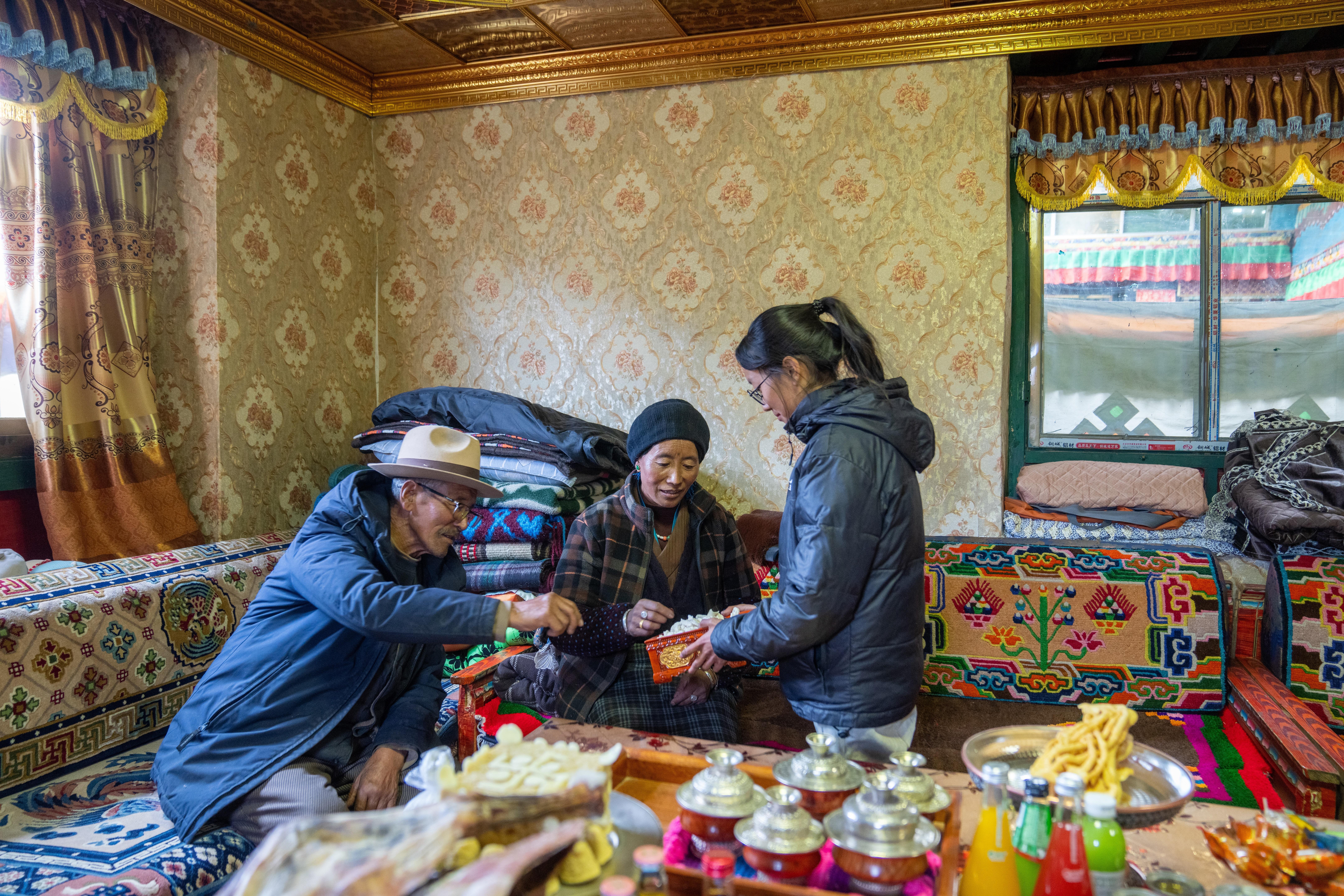 次旦一家人正在分享零食(2月22日攝)。新華社記者 旦增尼瑪曲珠 攝