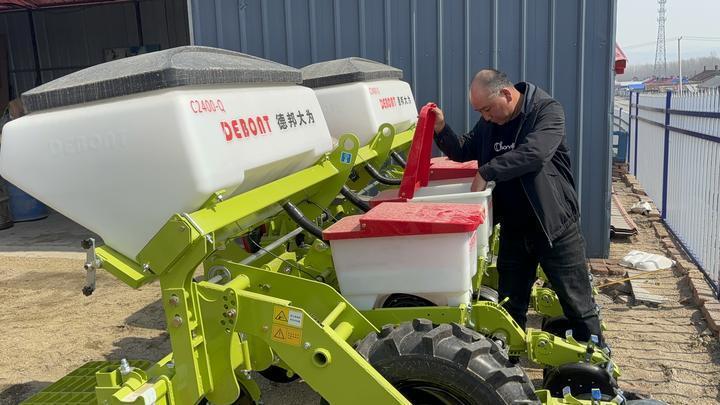 黑龍江省佳木斯市樺南縣明義鄉(xiāng)東輝村種地大戶陳少山,在播種前檢查新購(gòu)置的氣力式播種機(jī)。新華社記者黃騰 攝